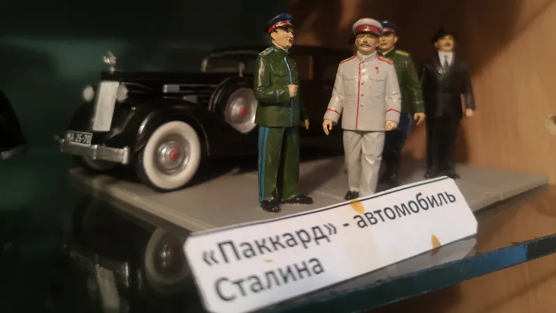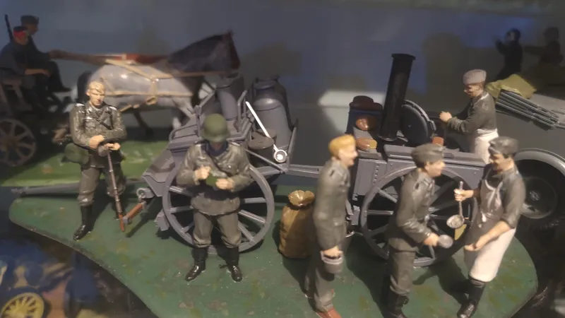 А здесь пленных ведет бдительный конвой. Неподалеку развернута полевая кухня, а пилоты занимаются подготовкой к боевому вылету. Сталин стоит рядом с бронированным автомобилем "Паккардом", подаренным ему президентом Рузвельтом.