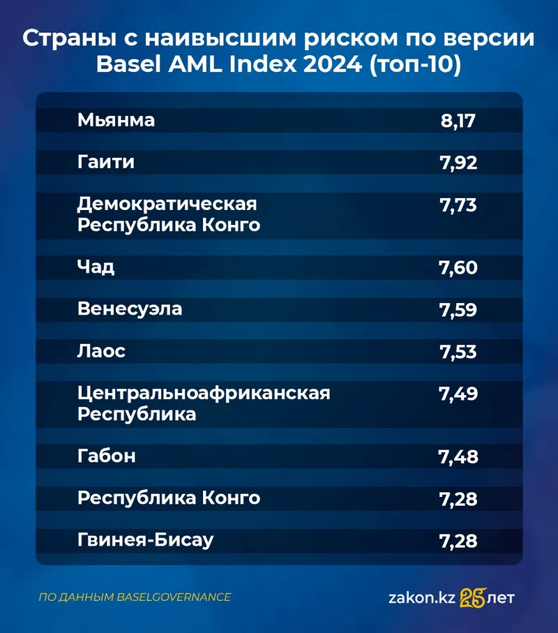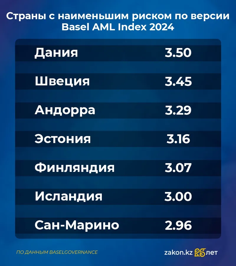 Согласно последнему изданию Basel AML Index 2024, Казахстан занял 111-е место из 164 стран, набрав 4,65 балла по 10-балльной шкале (где 0 – низкий риск, 10 – высокий риск). Это лучший результат для страны с момента запуска индекса в 2012 году.