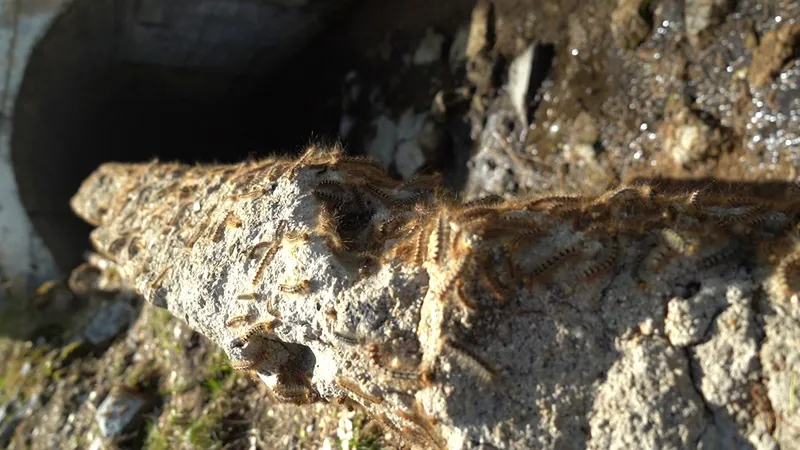 Личинки везде – на деревьях, на траве, на стенах домов, на заборах, на земле, в водоемах и в лужах. Даже заброшенную шахту они облепили плотным лохматым слоем.