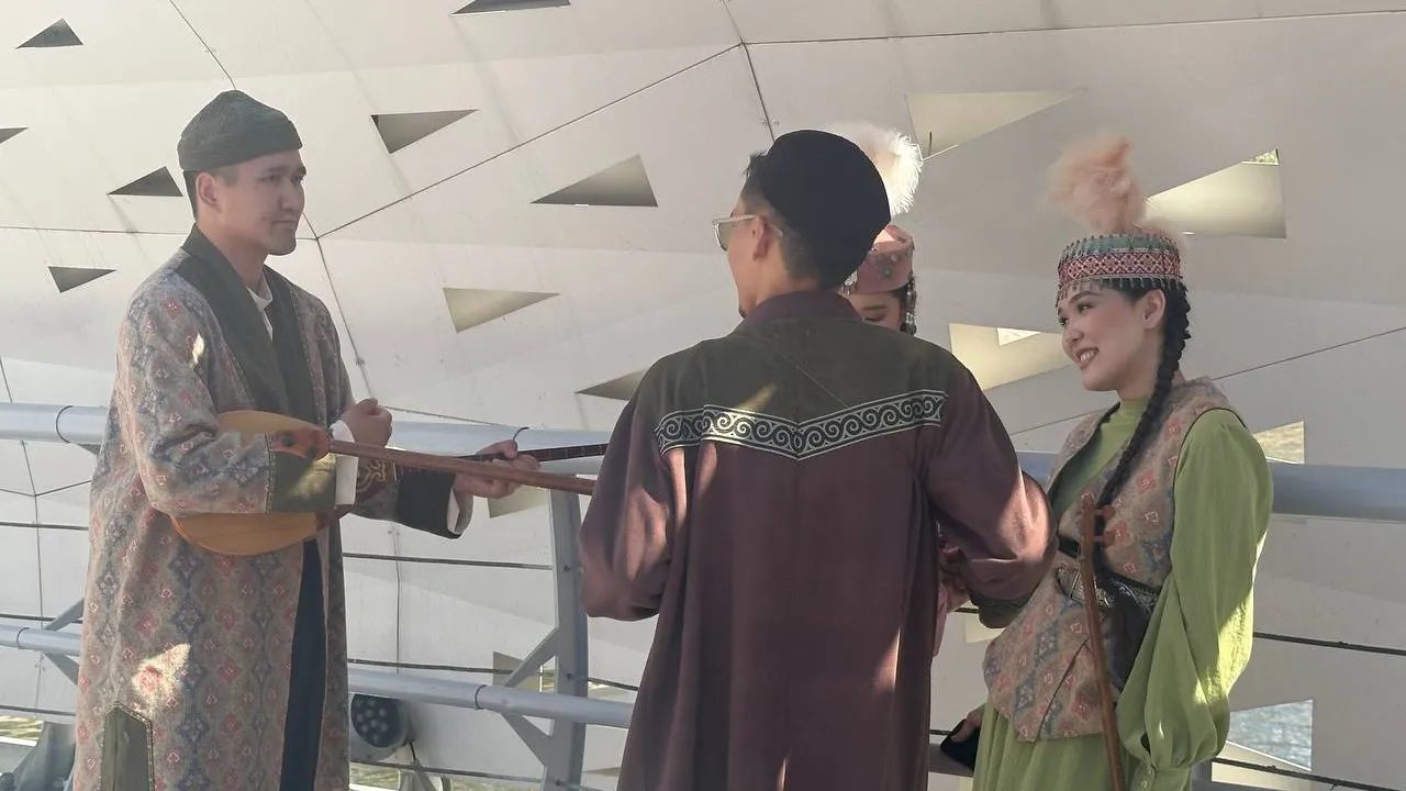 Мост превратился в единую театральную сцену: юноши и девушки в национальных костюмах гуляют, играют на домбре и поют. А еще они охотно фотографируются со всеми желающими.