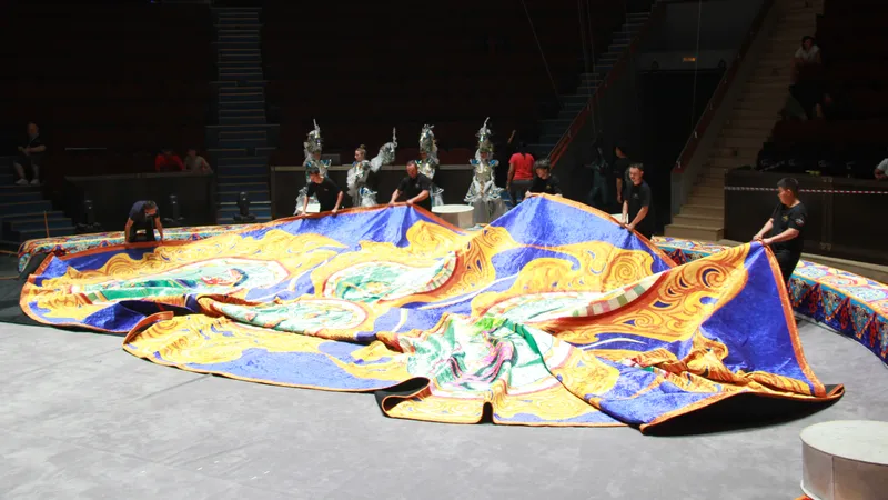 На арене кипит жизнь: слышен ритмичный стук обуви по настилу, в воздухе витает запах грима и пудры. Звуки репетиционных фанфар перемежаются с короткими командами постановщиков. Кто-то настраивает свет, кто-то проверяет страховку под куполом.