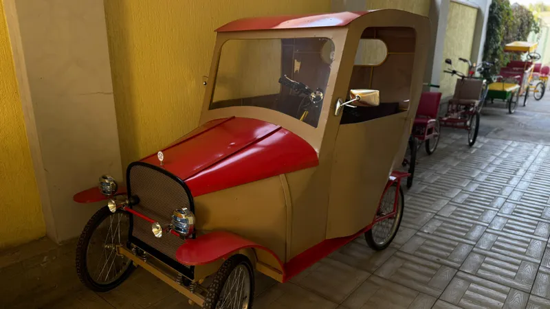 Особое место в его сердце занимает ретро-веломобиль, на создание которого ушло пять лет. Внешне он напоминает автомобиль начала XX века с глянцевым кузовом, хромированными деталями и капотом, который открывается. Однако внутри – велосипедные колеса, 7-скоростная трансмиссия и пружинная амортизация.