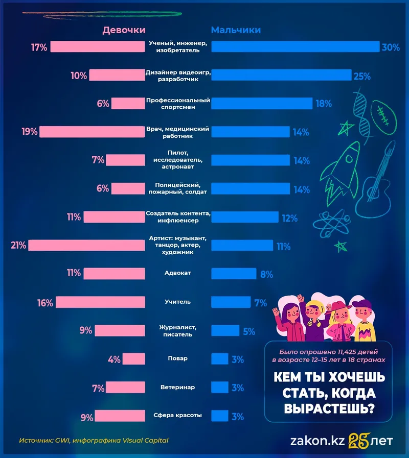 Это самый популярный карьерный путь среди подростков. Это сигнал: инновации, решение сложных задач и реальное влияние на мир для них звучат не как взрослые штампы, а как личный вызов. Это мечты тех, кому сейчас 12-15 лет. У них в головах не только уроки, но и большие чертежи будущего. Рядом в списке профессия дизайнера видеоигр и разработчика технологий. Четверть мальчиков и 10% девочек хотят не просто играть, а строить собственные цифровые миры. Для поколения Альфа гаджеты – это совсем не игрушки, а инструменты, и экраны – портал в их будущее "Я".