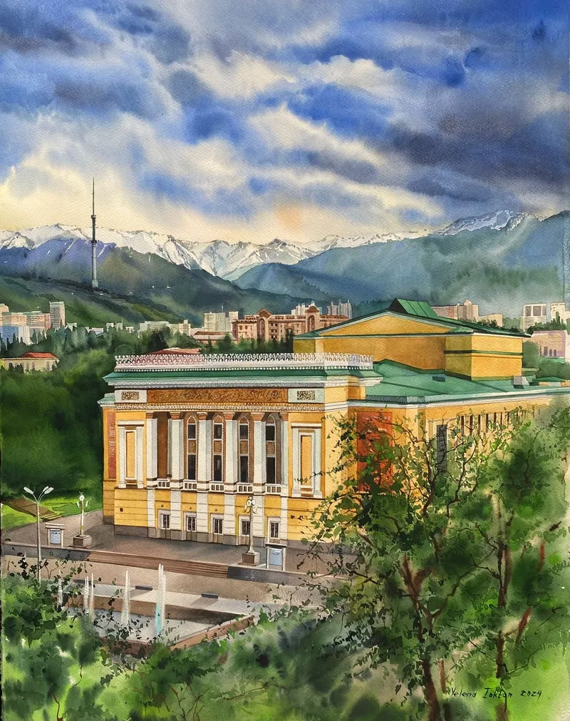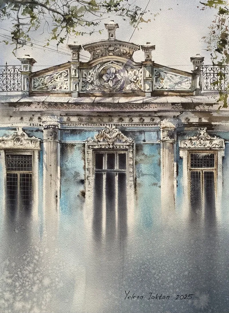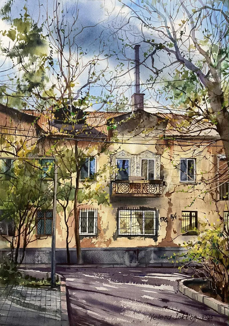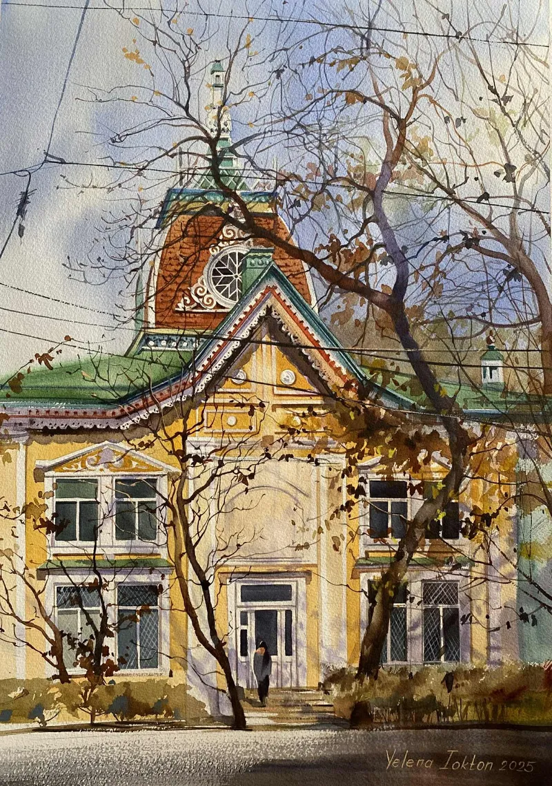 "Если взять последнюю работу, я ее вчера выставила – это дом купца Шахворостова, который на улице Фурманова. У него интересная история. Здание построено в 1890 году по проекту архитектора Андрея Зенкова. Сначала оно было национализировано, и в нем располагались различные госучреждения, после использовалось как медицинское училище, далее он стал музеем, было в нем и посольство США, и консульство Франции. В "золотом квадрате" шикарные здания остались. Еще хочу написать зеленый домик на Фурманова –Курмангазы. Очень много красивых домов, в которых живут старожилы".Елена Иоктон