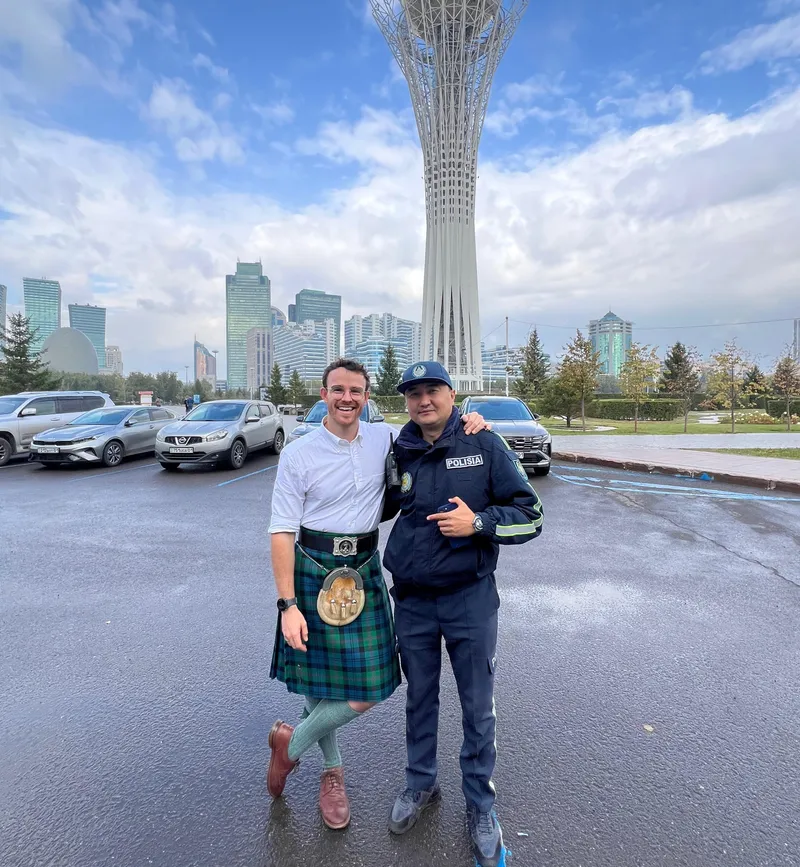 В Казахстане его особенно поразило сочетание природы, культуры и людей. Он с удовольствием общался с местными жителями, особенно когда надевал традиционный килт и доставал волынку. Это вызывало живой интерес, улыбки и беседы.