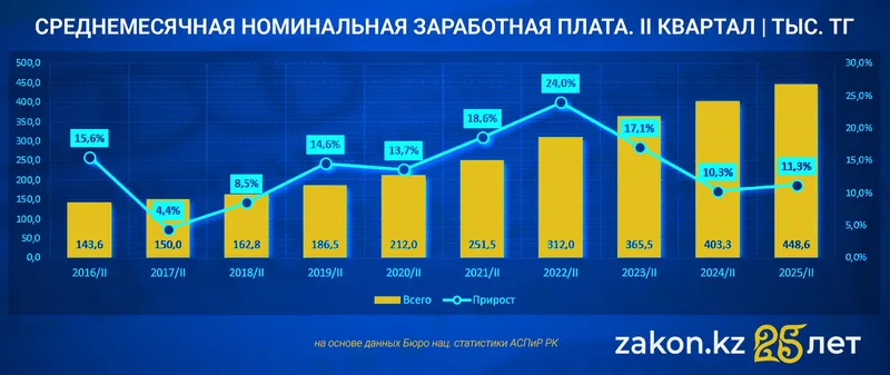 Как отмечают специалисты Ranking.kz, за пять лет среднемесячная номинальная заработная плата выросла более чем в 2 раза. Такая динамика отражает структурные сдвиги в экономике, развитие несырьевых отраслей, рост инвестиций и цифровизацию бизнеса.