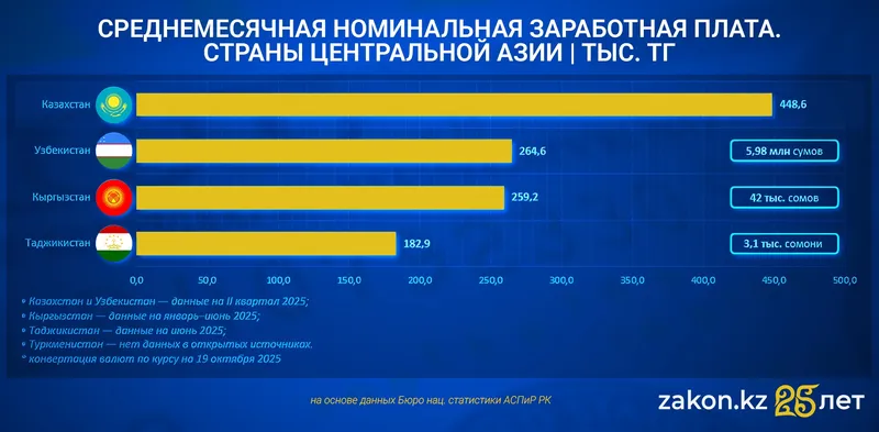 В целом уровень зарплат в Казахстане остается наивысшим среди стран Центральной Азии и значительно превышает средние показатели по региону. Так, среднемесячная номинальная заработная плата в РК (448,6 тыс. тенге) примерно на 70% больше, чем в Узбекистане (около 265 тыс. тенге), на 73% больше, чем в Кыргызстане (259,2 тыс. тенге), и почти в 2,5 раза больше, чем в Таджикистане.