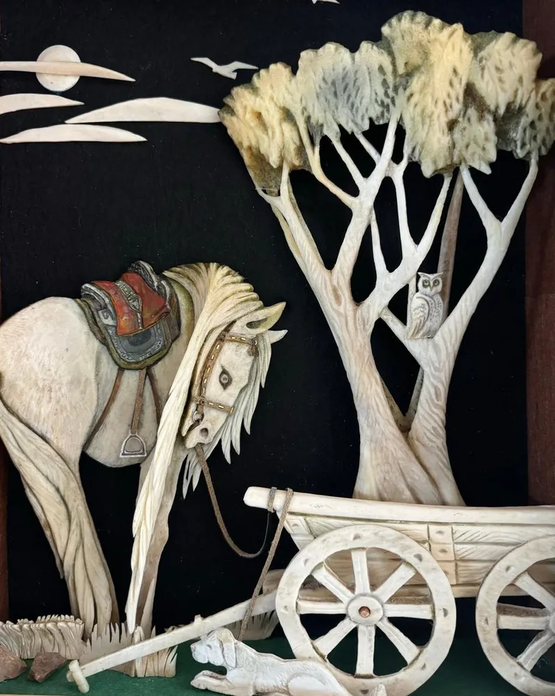 Свои картины косторез оценивает от 15 до 380 тыс. тенге, в зависимости от композиции. Только на продажу автор ничего не выставляет. Выполняет работы по большой просьбе покупателей.