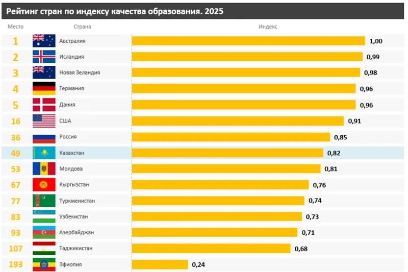 По качеству образования среди стран СНГ лидирует Россия. По данным международного портала Worldostats, в рейтинге стран мира по индексу качества образования в 2025 году РФ заняла 36-е место с показателем 0,85. Согласно методологии, индекс образования варьируется от 0 до 1 и зависит от нескольких факторов. Среди них уровень грамотности населения, среднее количество лет обучения, доступ граждан к качественному образованию. Казахстан в этом рейтинге идет вплотную с Россией с индексом 0,82.