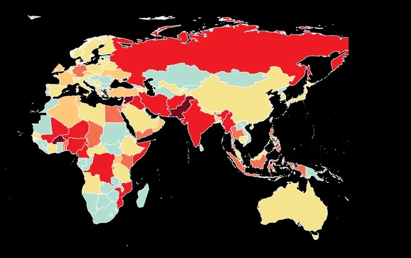 Но вернемся к GTI. Географический анализ данных, представленный на карте индекса, подтверждает глобальную тенденцию: подавляющее большинство стран с критическим уровнем угрозы (отмечены красным и бордовым цветом) сосредоточены в зонах конфликтов – в регионе Сахель, на Ближнем Востоке и в Южной Азии. В этом контексте Центральная Азия, включая Казахстан, остается относительно благополучным регионом с низким уровнем риска.