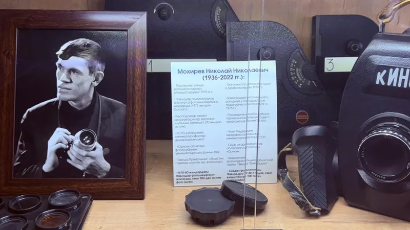 "Все кадры оцифрованного видео советского периода в соцсетях Павлодара сняты именно на нее. На полке стоит серая камера "Красноярск", сфотографированная у него в руках. На снимке он снимает парад 1 Мая, и у нас есть оцифрованное видео этого парада. Более того, сохранился его служебный пропуск на праздник. Мы прикрепили его к фотографии – получилось несколько точек вокруг одного события. Некоторые камеры я называю прадедушкой айфона: три линзы, три функции. Все придумано до нас. В конце экскурсии детям говорю: все, что вы видите в музее, сегодня находится в вашем телефоне", – рассказывает директор.