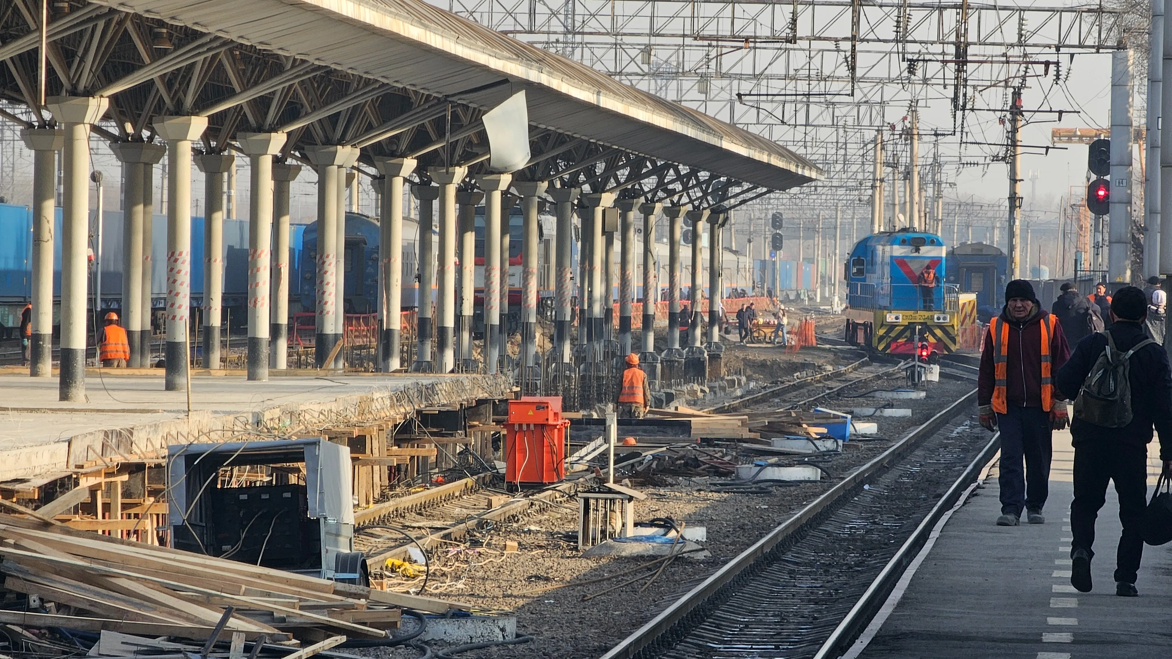 Перрон почти полностью перекрыт рабочими: где-то сверкают сварочные искры, в другой стороне грохочет техника, но рядом все равно стоят пассажиры, терпеливо ожидающие посадку, будто это самый обычный будний день.