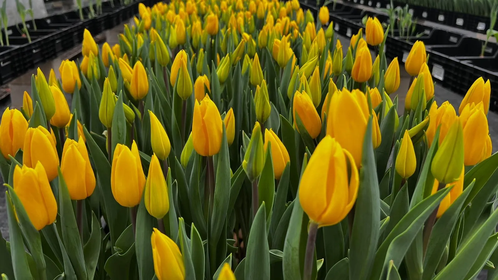Внутри теплицы – особенная атмосфера. Ряды тюльпанов тянутся до самого конца помещения, словно живой ковер из красных, желтых, белых и фиолетовых оттенков.