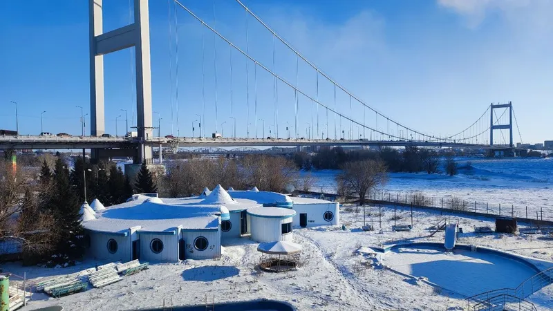 Аквапарк расположен рядом с подвесным мостом. И это не случайно. Его спроектировала та же японская компания, которая возвела переправу. А строительство доверили тем же специалистам, которые в 1993 году построили первый в Казахстане капчагайский аквапарк.