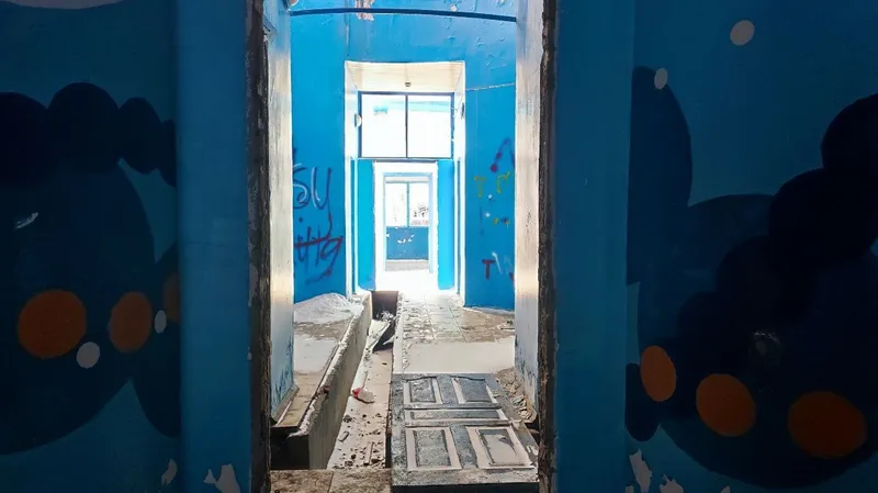 На стенах сохранилась кафельная плитка вперемешку с яркими героями из мультфильмов, которые еще недавно встречали посетителей на входе и провожали на главную развлекательную площадку.