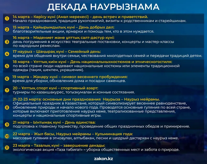 Каждый день декады будет посвящен отдельной теме и состоять из дней приветствий, добрых пожеланий, благотворительности, семьи, национальной одежды, обновления, единства и спорта. По всей стране организуют различные массовые мероприятия, которых в этом году запланировано более 1,5 тысячи. В республике будут проведены выставки, фестивали, литературно-музыкальные вечера и кинопоказы, благотворительные акции, культурно-спортивные мероприятия.