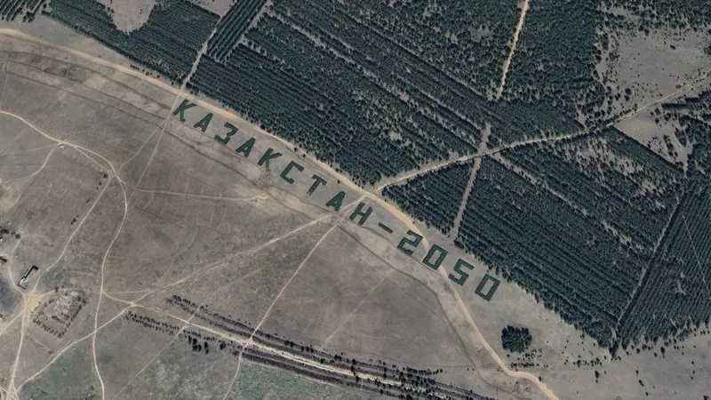 Бескарагайский район, по версии создателя маршрута и живущих там юных краеведов, может покорить одними только геоглифами. Одна из них – надпись "Казахстан-2050" длиной 1200 метров, которую в начале 2000-х годов высадили местные лесники из саженцев сосны. Деревья выросли и появилась надпись, которую видно даже из космоса. Высота одной хвойной буквы – 70 м, а ширина – 50 м. В соседней деревне Букебай есть такой же сосновый одноименный геоглиф.