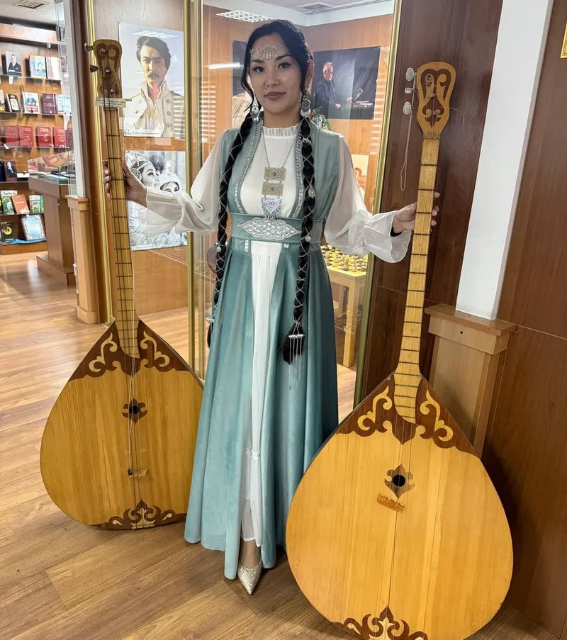 "К этому празднику готовилась с трепетом. Искала наряд нежных оттенков, выбрала небесно-голубой. Подобрала украшения из серебра – этот металл наши предки считали оберегом. Косы заплела, они не мои – накладные, но решила быть похожей на своих бабушек. На подготовку ушло несколько дней, с утра входила в образ. Национальная одежда находит место в гардеробе современных казахстанцев. Молодежь любит этностиль".Архивист Асель Мызлыкова