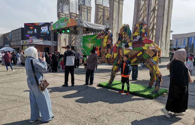 Рядом со сценой установили несколько арт-объектов из пластиковых бутылок. Один из таких верблюдов функционален, его можно наполнить легкими отходами. Инсталляции из материалов, бывших в употреблении, напоминают о важности сохранения экологии.