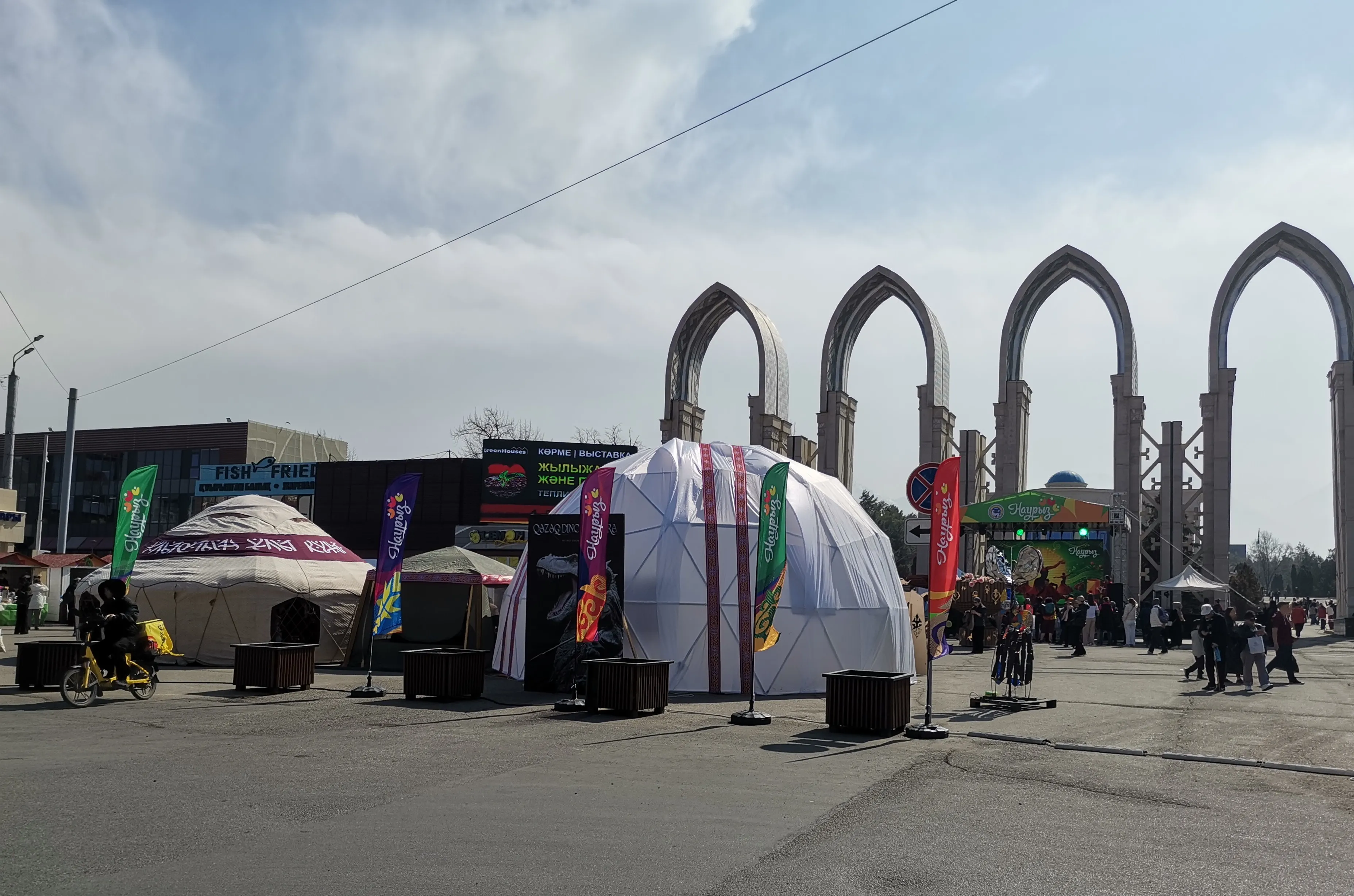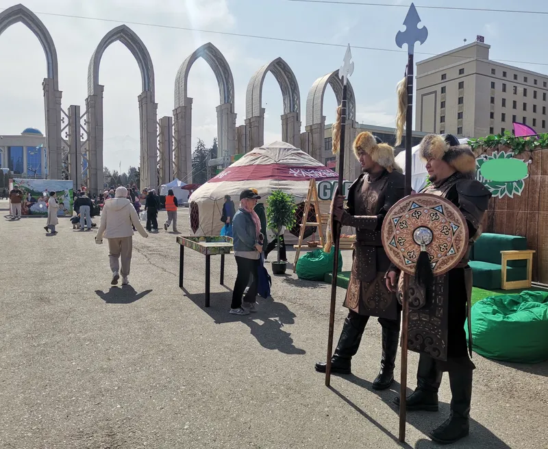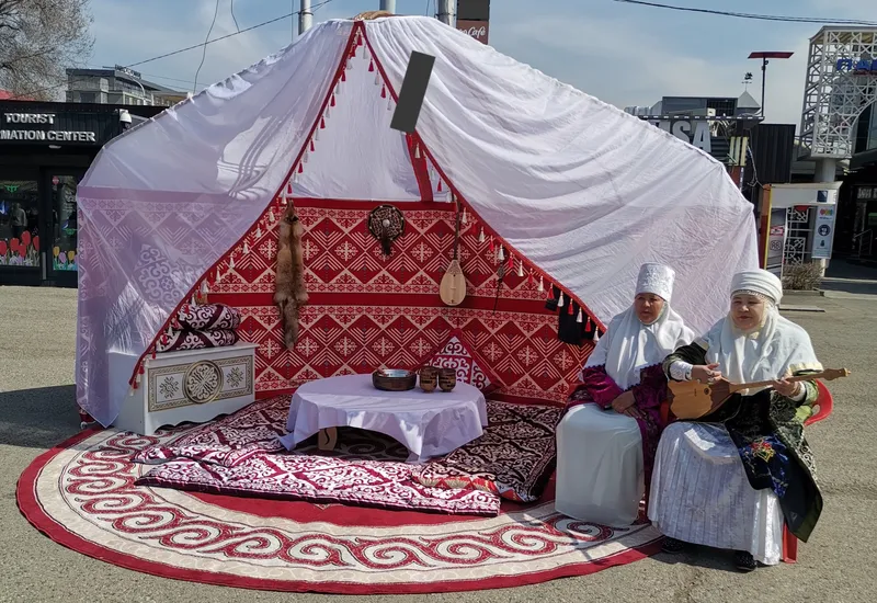 Многие алматинцы встречают Наурыз на площади возле "Атакента". Сегодня это место выглядит особенно ярко. Около куполообразных арок установили юрты. Гостей приглашают зайти внутрь и посмотреть древний быт кочевников.