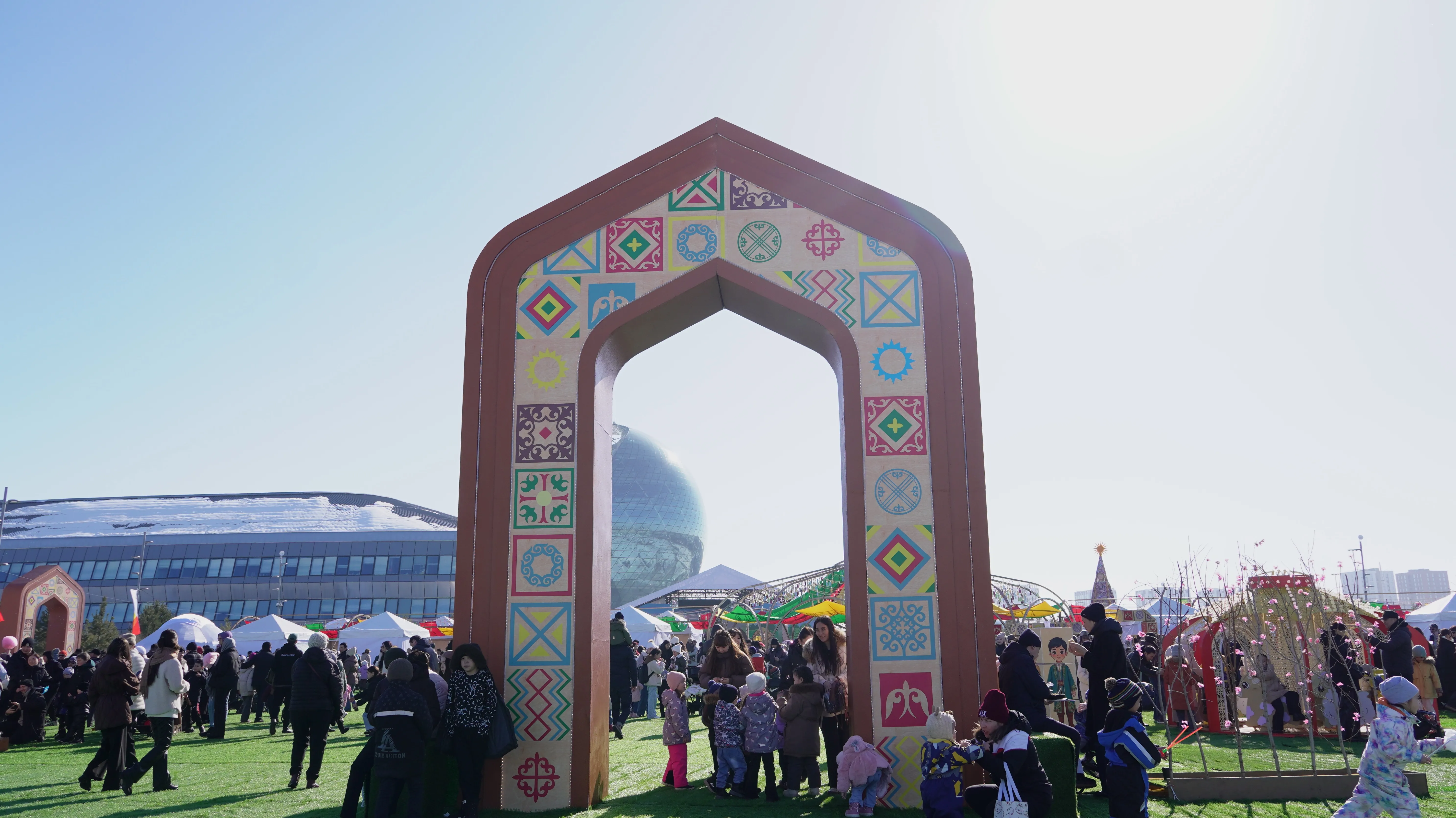 Пространство оформлено в национальном стиле — с тайказанами, арками и элементами шанырака, а крупные инсталляции задают визуальный ритм всей площадке.