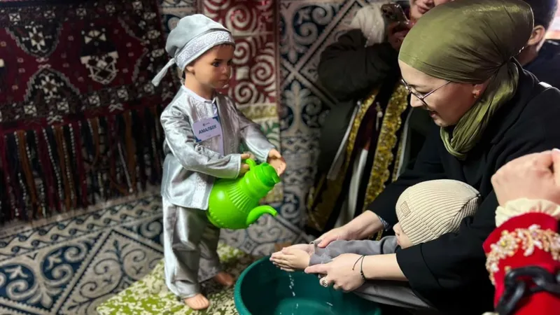 Особый интерес у гостей вызвал мальчик-робот Амалбек, который был создан в 2025 году. Он наливал из кувшина воду для мытья рук.