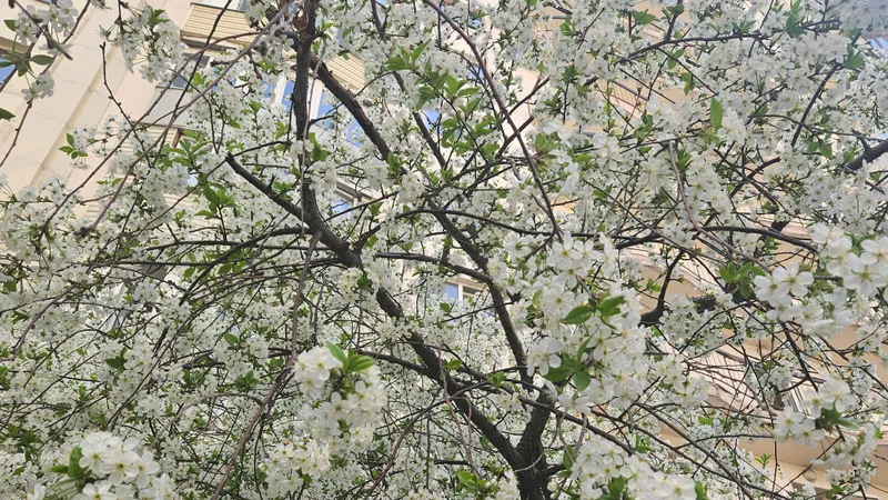 Весна разрисовывает улицы, выкладывает алмазную мозаику прямо поверх их серого молчания. Взмах руки – и скромный двор обычной многоэтажки расшивается по подолу кипенно-белым кружевом, таким тоненьким на фоне жесткого "корсета" из стекла и бетона.