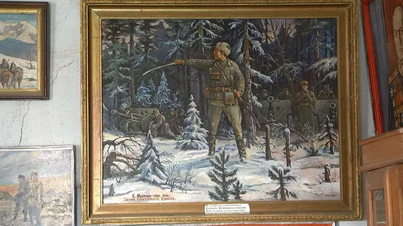 Особое место в военной коллекции занимают картины: на полотнах – сцены ожесточенных боев и портреты героев. Таким образом мужчина стремится сохранить память о подвигах соотечественников и передать ее будущим поколениям. В самом центре – портрет Бауыржана Момышулы, на ее написание было потрачено большое количество времени.