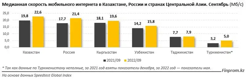 Как пишет finprom.kz, в соседней России показатель составил 21,4 Мб/с. Среди стран Центральной Азии следом за Казахстаном идут Кыргызстан (19,6 Мб/с), Узбекистан (15,8 Мб/с), Таджикистан (7,9 Мб/с).