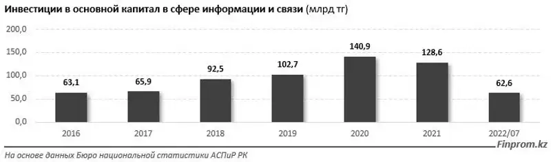 За январь-июль текущего года показатель составил 62,6 млрд тенге, за весь 2021 год – 128,6 млрд тенге. Львиная доля инвестиций в секторе обеспечена собственными средствами операторов связи, – отмечается в сообщении.