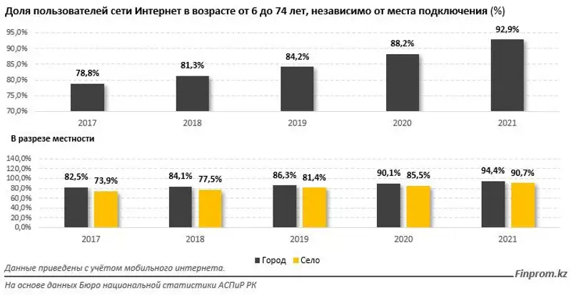 В Казахстане в 2021 году доля пользователей интернета с учетом мобильного соединения в возрасте от 6 до 74 лет составила сразу 92,9%, что на 4,7 п. п. больше по сравнению с 2020 годом.