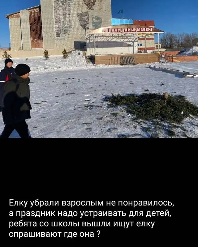 Дети поселка Касыма Кайсенова после уроков пошли посмотреть на елку, но не нашли ее. Как оказалось, ее убрали после возмущений местных жителей.