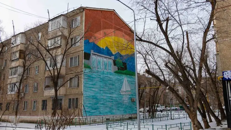 На 9-этажном доме при въезде в город нанесен мурал Кунаева.