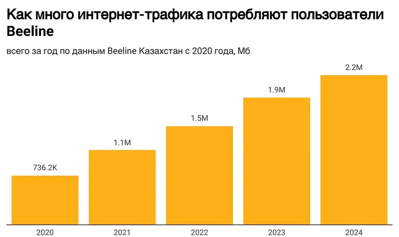 - Рост потребления и рост инвестиций в отрасль. Каждый год казахстанцы потребляют все больше интернет-трафика. Например, в 2024 году абоненты Beeline потратили на 18% Гб больше, чем в 2023 году. Мы по-прежнему остаемся очень активными пользователями: если в среднем в мире потребляют около 18 Гб в месяц (данные GSMA Intelligence), то абоненты Beeline – почти 20 Гб, а в отдельных регионах больше 30 Гб".