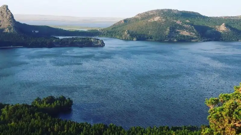 Путешествие начинается с Голубого залива. Место пользуется популярностью среди туристов и любителей природы, привлекая их своим живописным окружением и возможностями для отдыха на природе. Поднимитесь на гору Болектау и насладитесь панорамными видами озер Бурабай и Большое Чебачье и окружающую природу. В качестве бонуса вы также сможете увидеть скалу Жумбактас, Окжетпес.