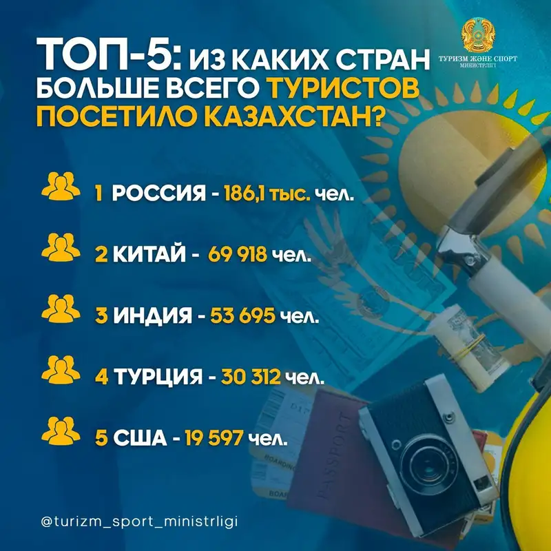 "Наибольшее количество путешественников... прибыли из Российской Федерации – 186,1 тыс. человек. Второе место заняли китайские туристы – 69 918 человек. На третьей позиции – туристы из Индии (53 695 человек). В топ-5 также вошли путешественники из Турции (30 312) и США (19 597)".Пресс-служба МТС РК