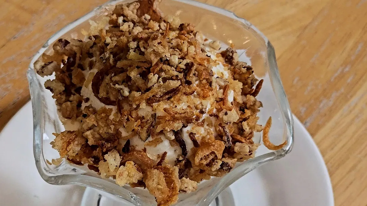 Мороженое с курицей-гриль стало настоящим хитом. Оно изготавливается на молочной основе с добавлением специй, имитирующих вкус мяса на углях, и подается с жареным луком, карамелью и миндалем.