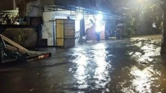 A few minutes ago: Heavy rainfall caused the river near Kumbasari Market to overflow, with water rising into traders’ stalls around the bridge.