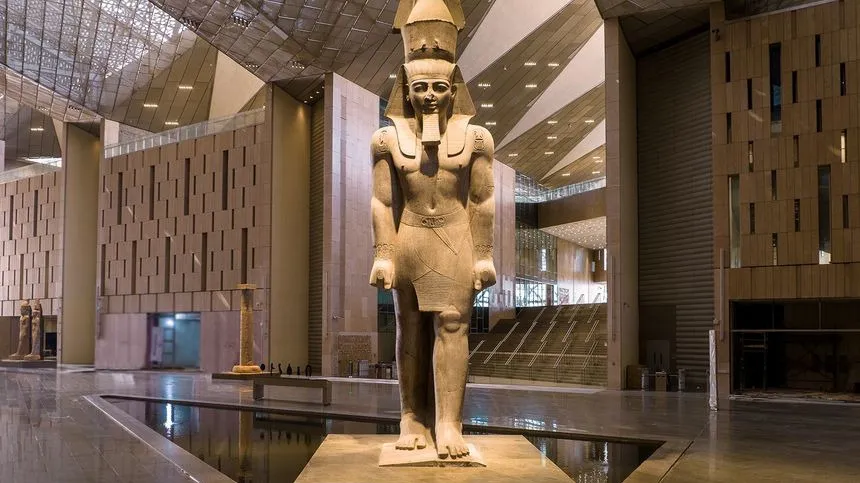 В Большом Египетском музее размещены более 50 тысяч экспонатов, включая 83-тонный колосс Рамсеса II возрастом 3200 лет и 4500-летнюю ладью фараона Хеопса, которому приписывают строительство пирамид.
