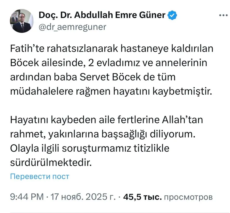 Об этом 17 ноября на своей странице в соцсети X сообщил глава Департамента здравоохранения провинции Стамбул Абдуллах Гюнер.