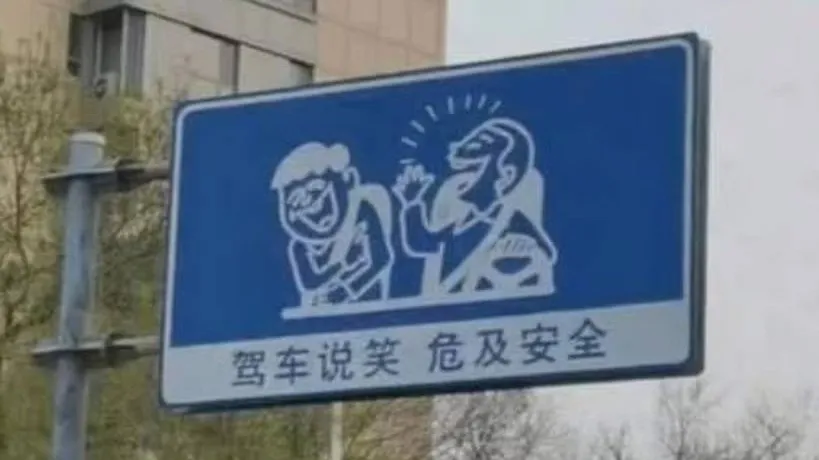 На знаке изображена карикатура, на которой водитель и пассажир смеются и обмениваются шутками. Об этом передает The South China Morning Post.
