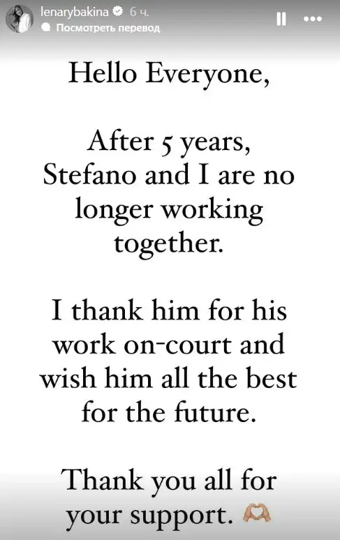 "После пяти лет сотрудничества Стефано и я больше не работаем вместе. Я благодарна ему за его работу на корте и желаю всего самого лучшего в будущем. Спасибо всем вам за вашу поддержку", – написала казахстанская теннисистка в социальных сетях.