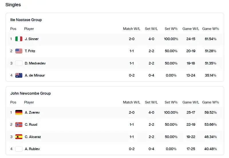 В группе "Илие Настасе" две победы одержал итальянец Янник Синнер, по одной – у американца Тейлора Фрица и россиянина Даниила Медведева. Австралиец Алекс де Минор потерпел два поражения подряд.