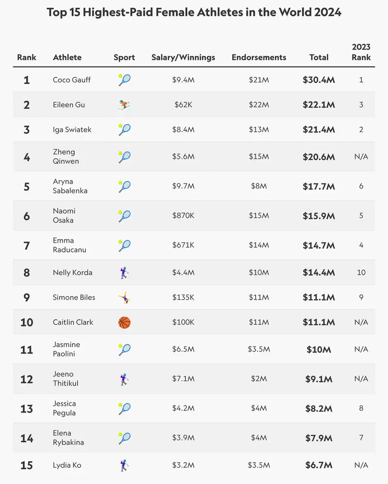 The 2024 Highest-Paid Female Athlete list is here! The latest from @kbadenhausen, tennis players dominate the list, with Coco Gauff leading the way with $30.4M in earnings this year.