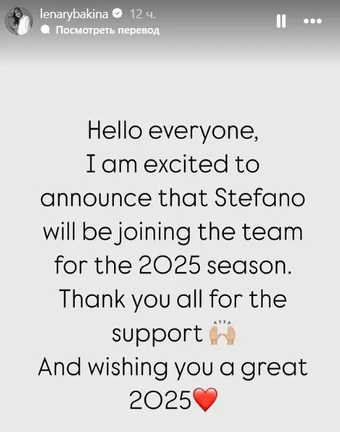 "Привет всем, я рада сообщить, что Стефано присоединится к команде на сезон-2025. Спасибо всем за поддержку. Пусть ваш 2025-й год будет отличным", – написала Рыбакина в социальной сети (сторис).