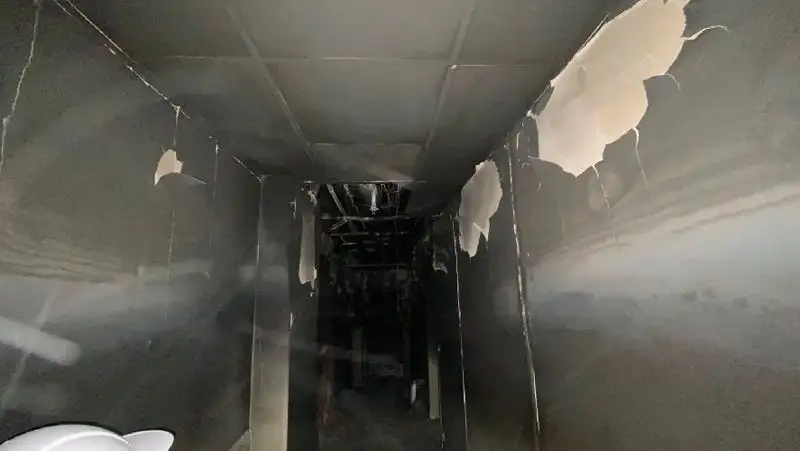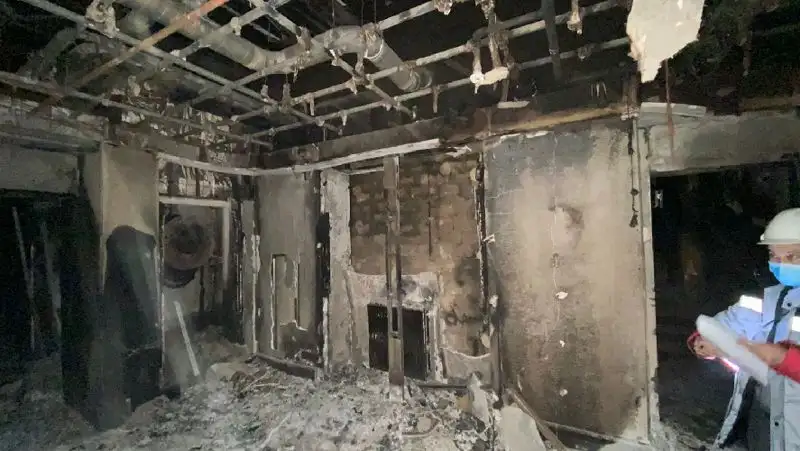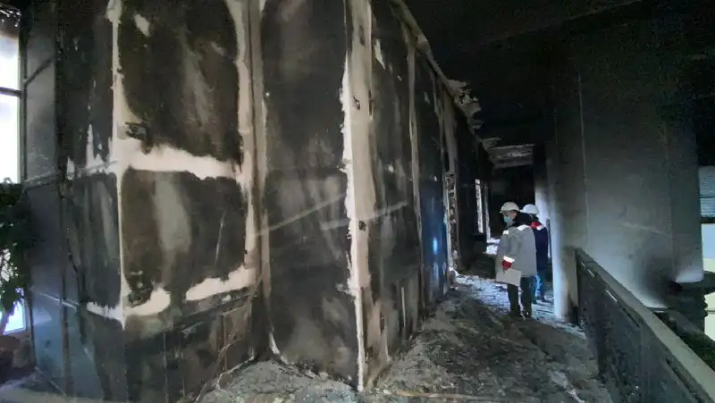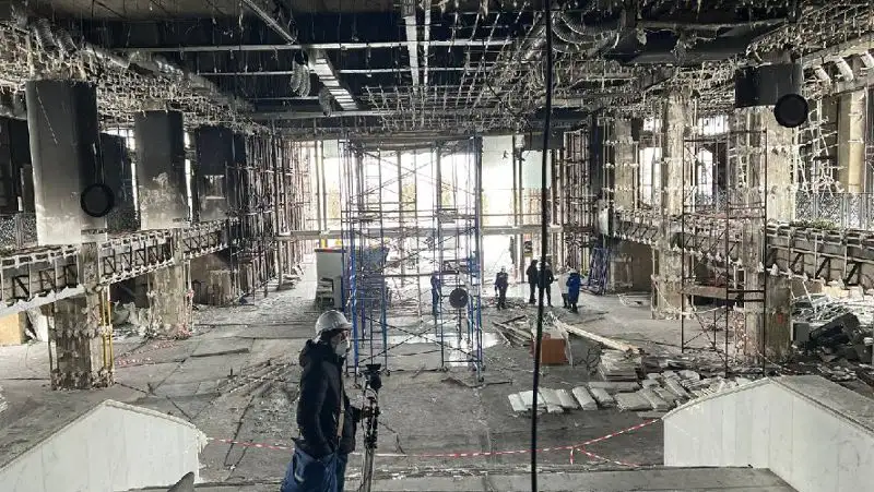 На первом этаже сгорел и взорвался автомобиль, загнанный туда погромщиками. Столб огня, поднявшись вверх, расплавил стальные конструкции верхних этажей. Уничтожены все системы жизнеобеспечения. Самым опасным является повреждение несущих конструкций второго этажа. Этот факт поставил под вопрос дальнейшую жизнеспособность здания.Пресс-служба УДП РК
