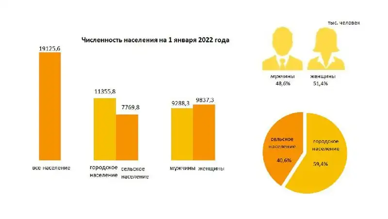Городское население составляет 11 355,8 тыс. (59,4%) человек, сельское – 7 769,8 тыс. (40,6%) человек.