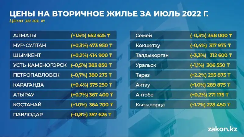 При этом, по данным Krisha.kz, наибольший рост цен на вторичное жилье в июле был зафиксирован в Таразе – 2,2%.