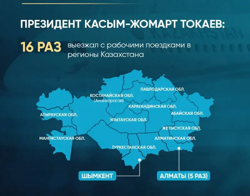 По данным пресс-службы президента, в 2022 году Касым-Жомарт Токаев совершил ряд поездок по стране и за рубеж: