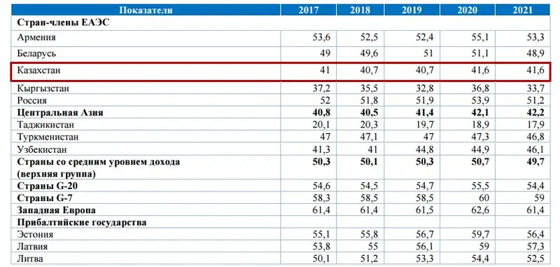Сравнение отдельных показателей в рамках ЕАЭС показывает, что самый высокий показатель ВВП на душу населения в Казахстане не коррелируется с показателями уровня жизни. В частности, Казахстан уступает России и Беларуси по показателям среднего размера назначенной пенсии и минимального размера оплаты труда.